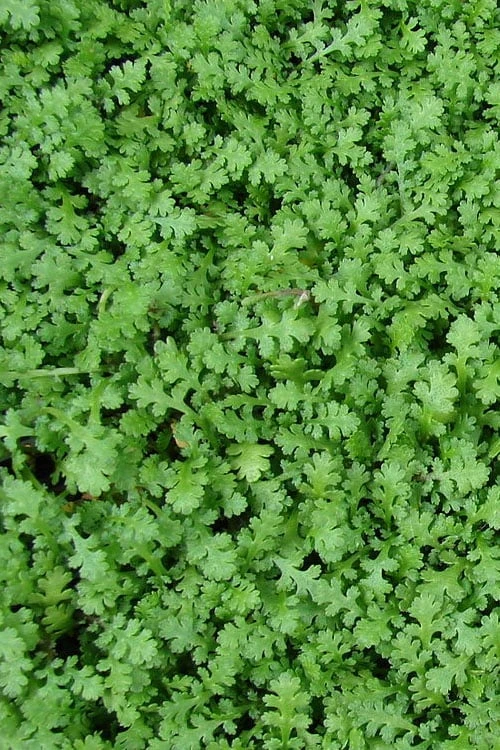 Leptinella gruveri, commonly known as miniature brass buttons or mini fairy fern, is a versatile, dense, matt-forming, shade-loving perennial that stands up well to foot traffic, which makes it ideal for use as a groundcover, edging, underplanting for shrubs and trees, as a lawn substitute, as a soil cover in container gardens, or to fill the gaps between stepping stones and pavers. Its attractive, tiny, fern-like muted green foliage grows to an inch in height and a foot wide. Small, round, yellow-green flowers appear in late spring to early summer. It thrives in a moist but well-draining soil and part to full shade.