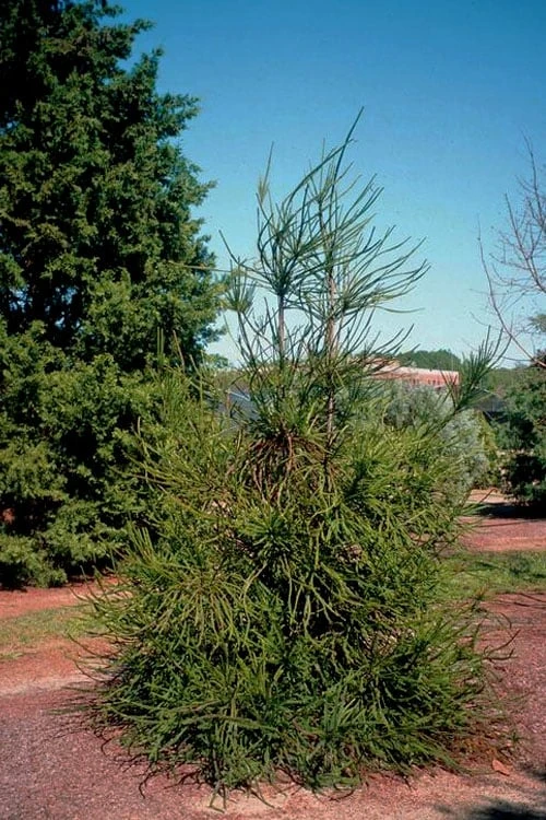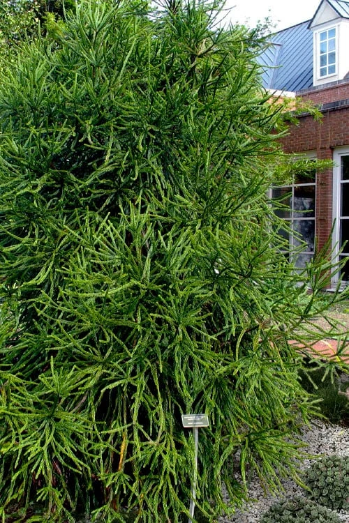 A very old but rare and exceptionally unusual looking coniferous evergreen, and a must for eccentric gardeners who love eccentric plants, Cryptomeria japonica ‘Araucarioides’, commonly called Snake Branch Japanese Cedar, is sure to add a distinct look and feel to your landscape. Visitors to our nursery have described it as anything from “bizzare” to “freakish” or “strange,” but we’d say it’s just fantastically extraordinary! The most outstanding feature of the Snake Branch Japanese Cedar is its long, drooping, snake-like branchlets. But don’t worry, the branches don’t bite:-) During its younger years the plant is more open and see-through. Over time, as the tree grows it naturally becomes more dense, though a little annual pruning can maintain the see-through appearance if desired. The appeal with this oddity doesn’t stop with its unusual form. In cold weather, the short and thick medium blue-green needles turn to an unusual and attractive mix of deep burgundy, black and bronze!